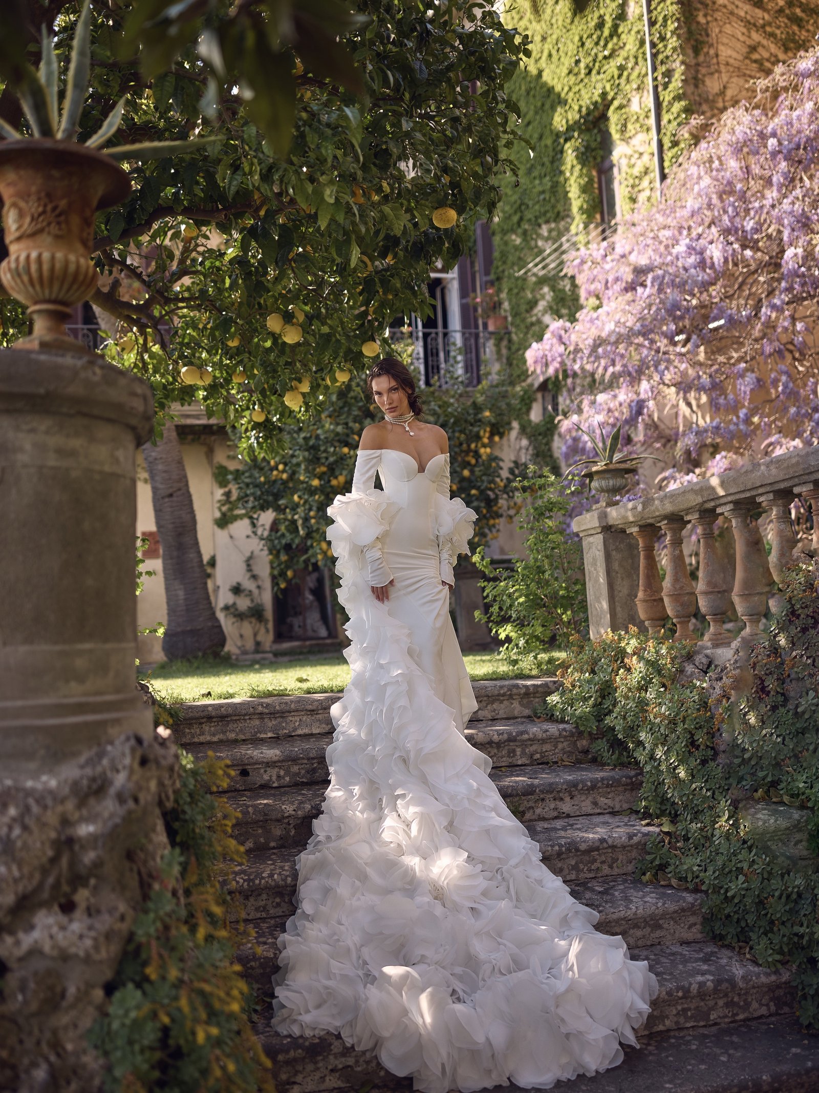 – Depending on the neckline, leave your hair down in nice waves to complement the ethereal feel of the dress. The perfect combination for that would be an off-the-shoulder moment.