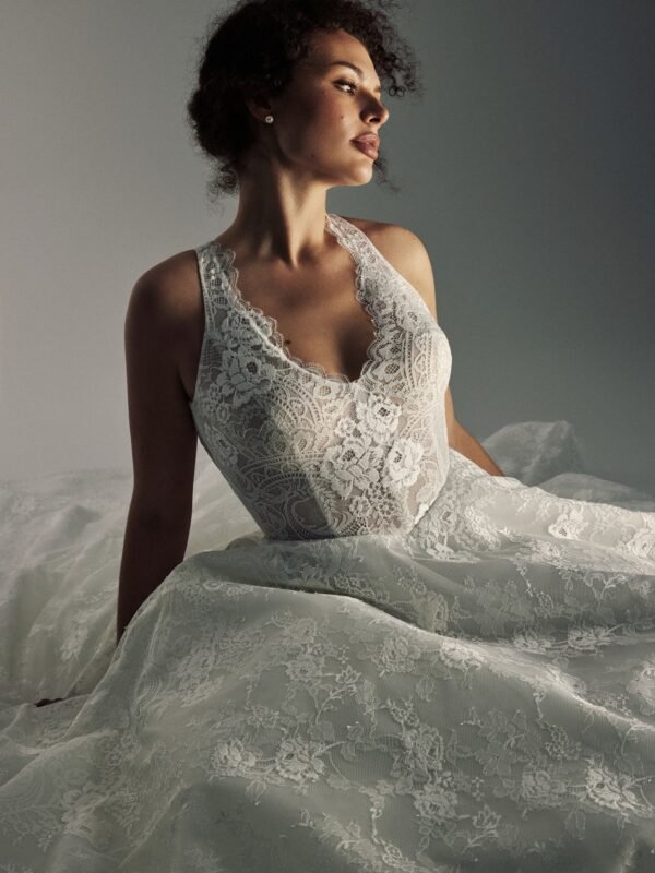 Petite brides should choose a ball gown wedding dress with a less full skirt or even an A-line silhouette to keep proportions well-balanced. Avoid ballroom gowns with excessive and ruffled skirts if you don’t want to appear shorter than you are.